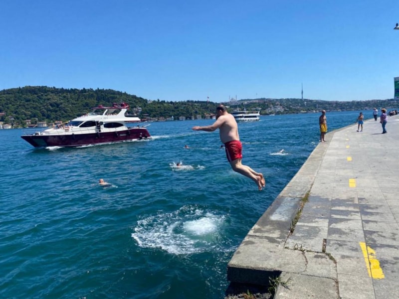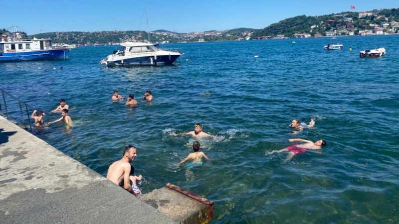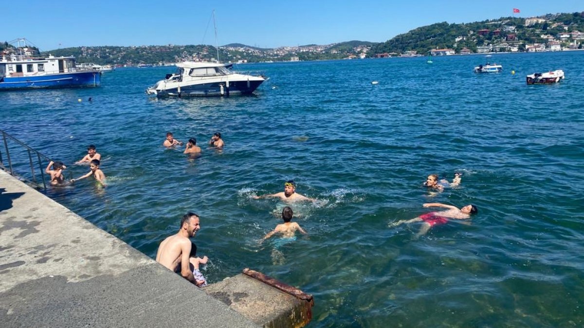 Birçok vatandaş, Arnavutköy Sahili Akıntıburnu'nda boğazın serin sularına atlayarak yüzdü.