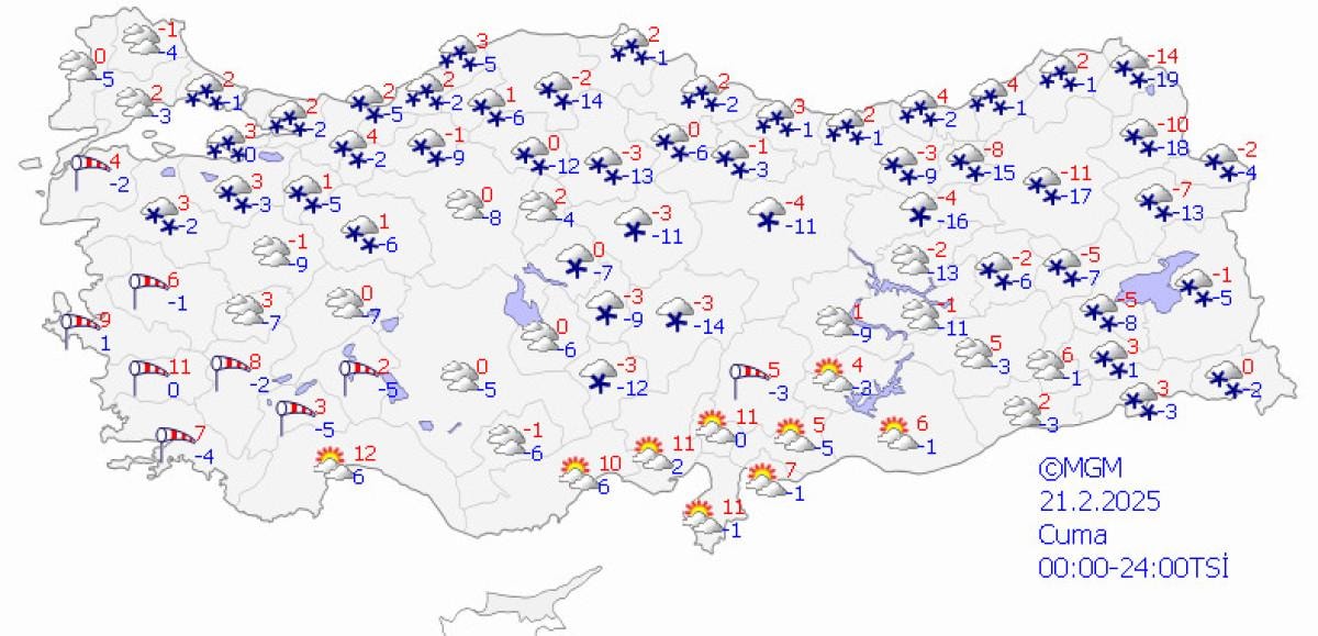 Çok bulutlu ve aralıklı kar yağışlı geçeceği tahmin ediliyor. Yağışların; kuvvetli olması bekleniyor.