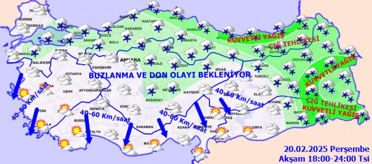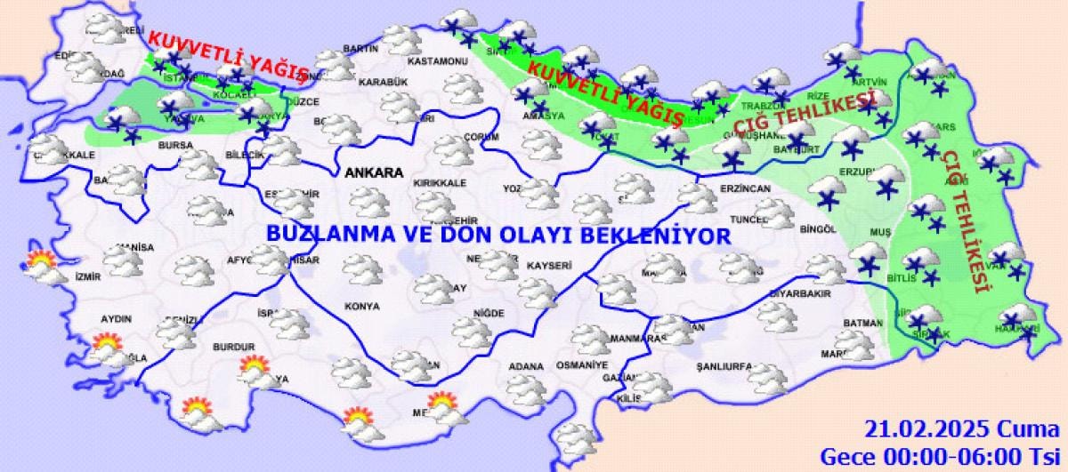 MGM'den yapılan açıklamada, bugün sabah saatlerinden itibaren il genelinde görülecek kar yağışlarının, cuma ve cumartesi günleri kuvvetli ve yer yer yoğun olmak üzere pazar öğle saatlerine kadar devam edeceği, buzlanma ve don olayının ise pazartesi günü sabah saatlerine kadar il genelinde etkili olacağı belirtildi.