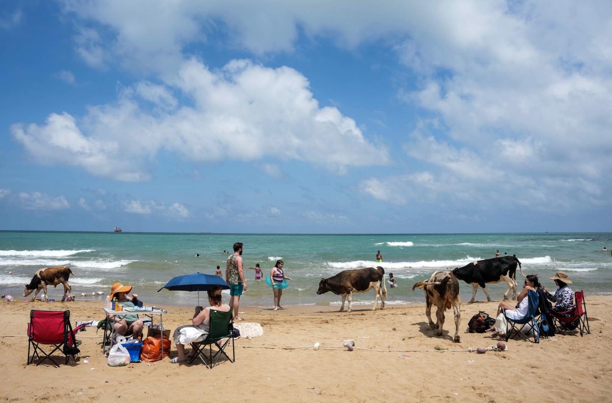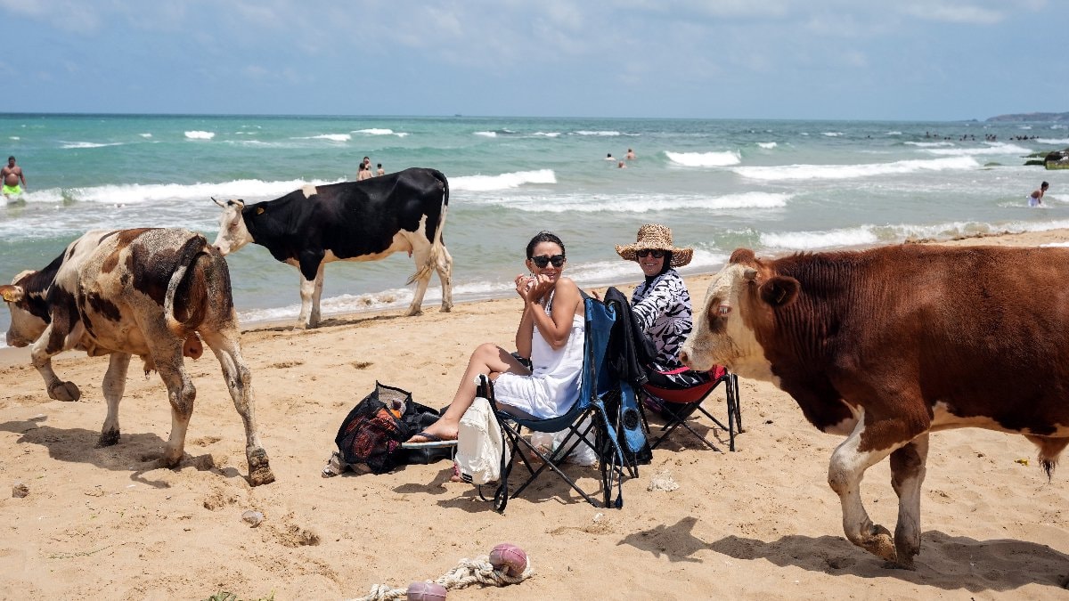 İnekler, vatandaşların arasında dolaşarak suyun kenarında serinledi.
