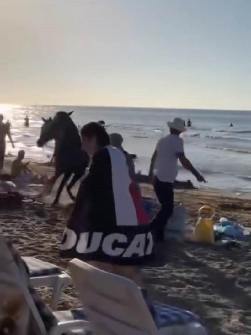 İki at, serbest kalınca denize girmek için gelen yüzlerce insanların içine daldı.