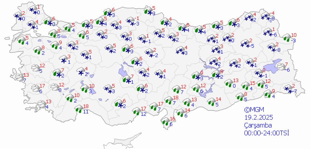 Çok bulutlu, aralıklı yağmur ve karla karışık yağmurlu geçeceği tahmin ediliyor. Yağışların yerel kuvvetli olması bekleniyor.