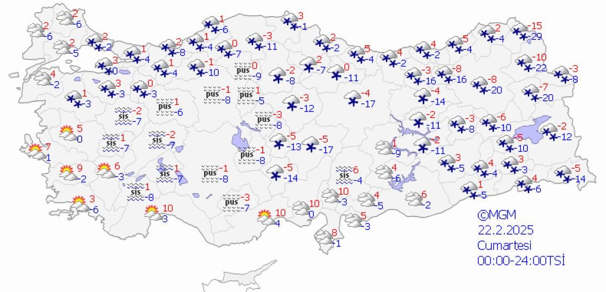 "Çarşamba gününden itibaren bir haftalık periyotta gerçekleşmesi beklenen en düşük hava sıcaklıkları şöyle: Ankara -8, İstanbul -1, İzmir 1, Konya -8, Antalya 3, Bolu -10, Samsun -3, Trabzon -2, Erzurum -20, Diyarbakır -5."