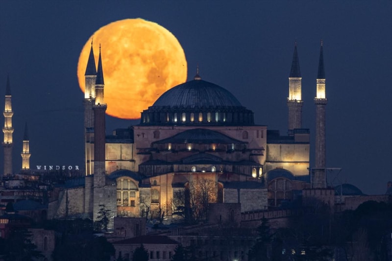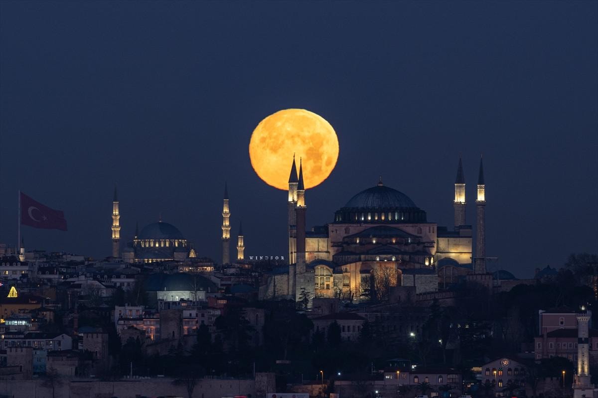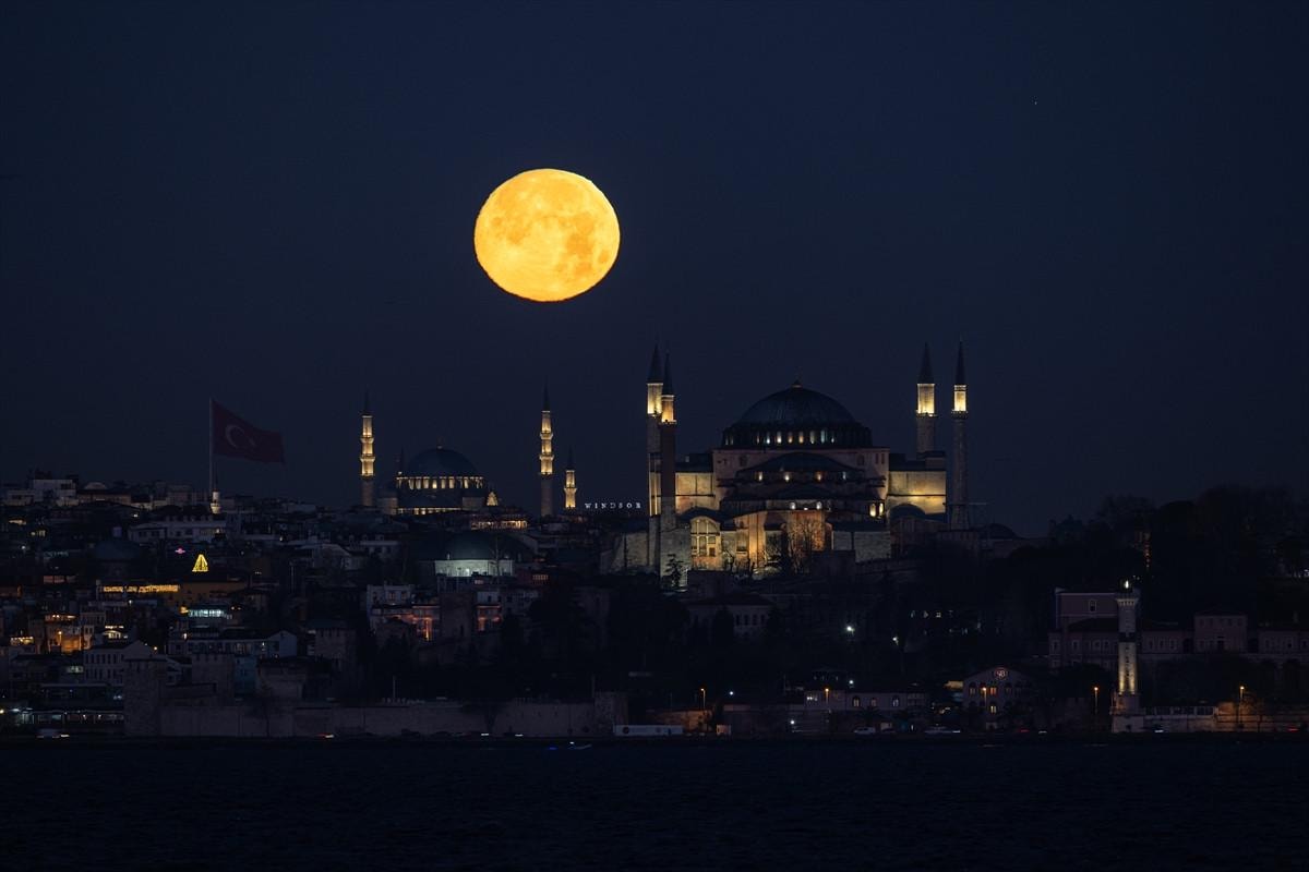 Beliren dolunay, Ayasofya-i Kebir Camii Şerifi'nin üzerinde eşsiz kareler oluşturdu.