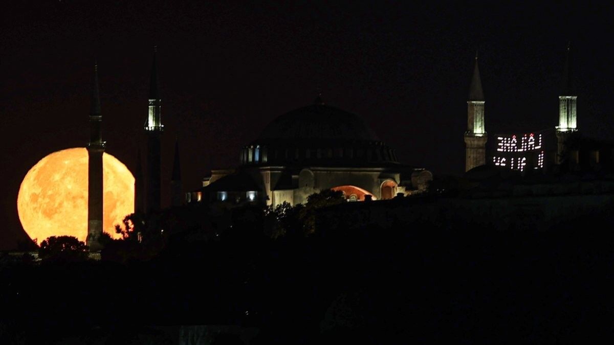 Gece yarısındaki dolunay, Sultanahmet Camisi, Ayasofya-i Kebir Cami-i Şerifi ve Süleymaniye Camisi ile güzel görüntü oluşturdu.