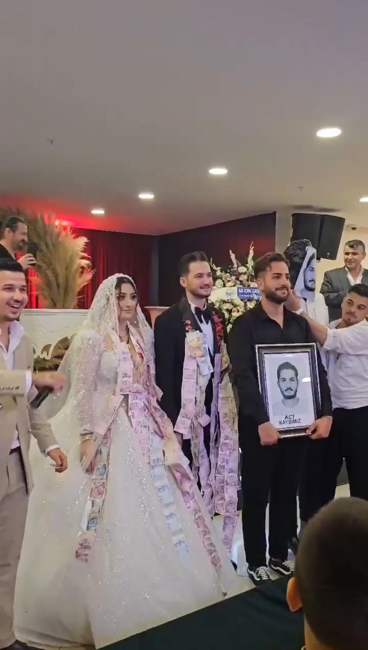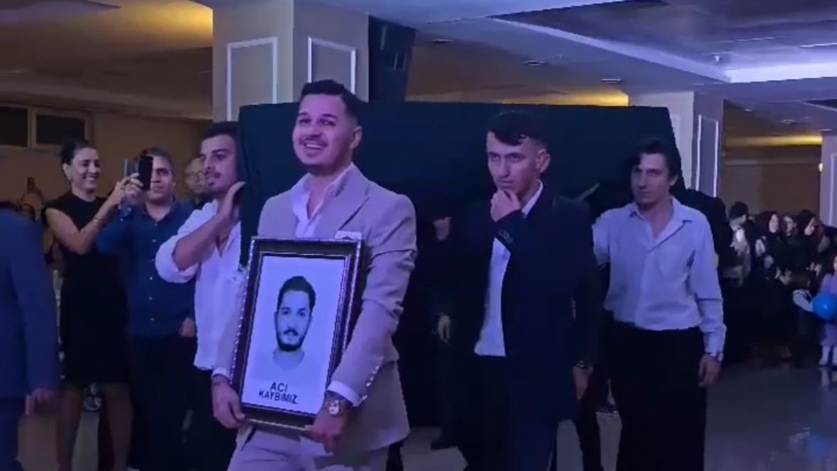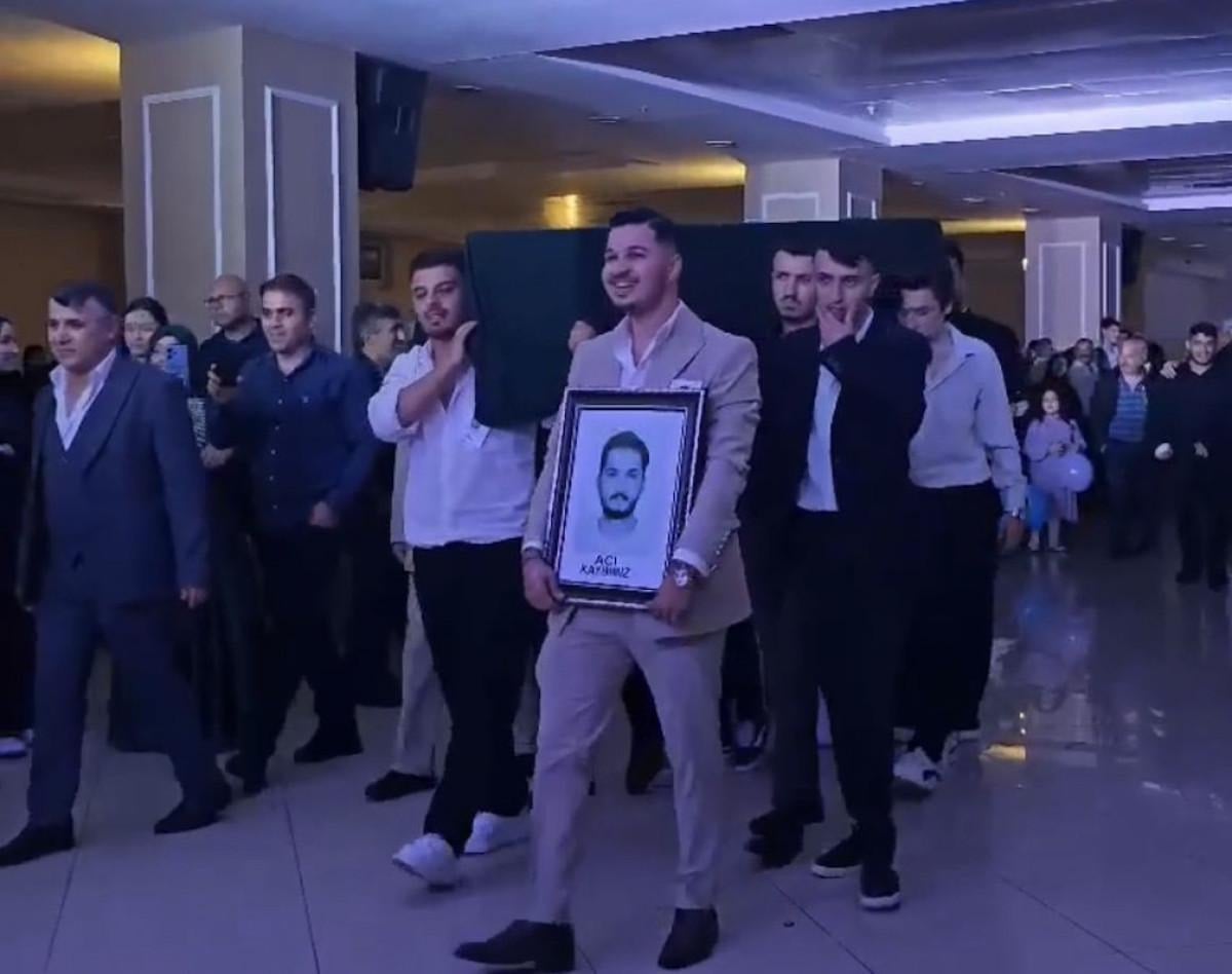 Önde damadın 'acı kaybımız' yazılı fotoğrafı, arkasında ise tabutla çiftin yanına gelen grup, alkış eşliğinde tabutu indirdi.