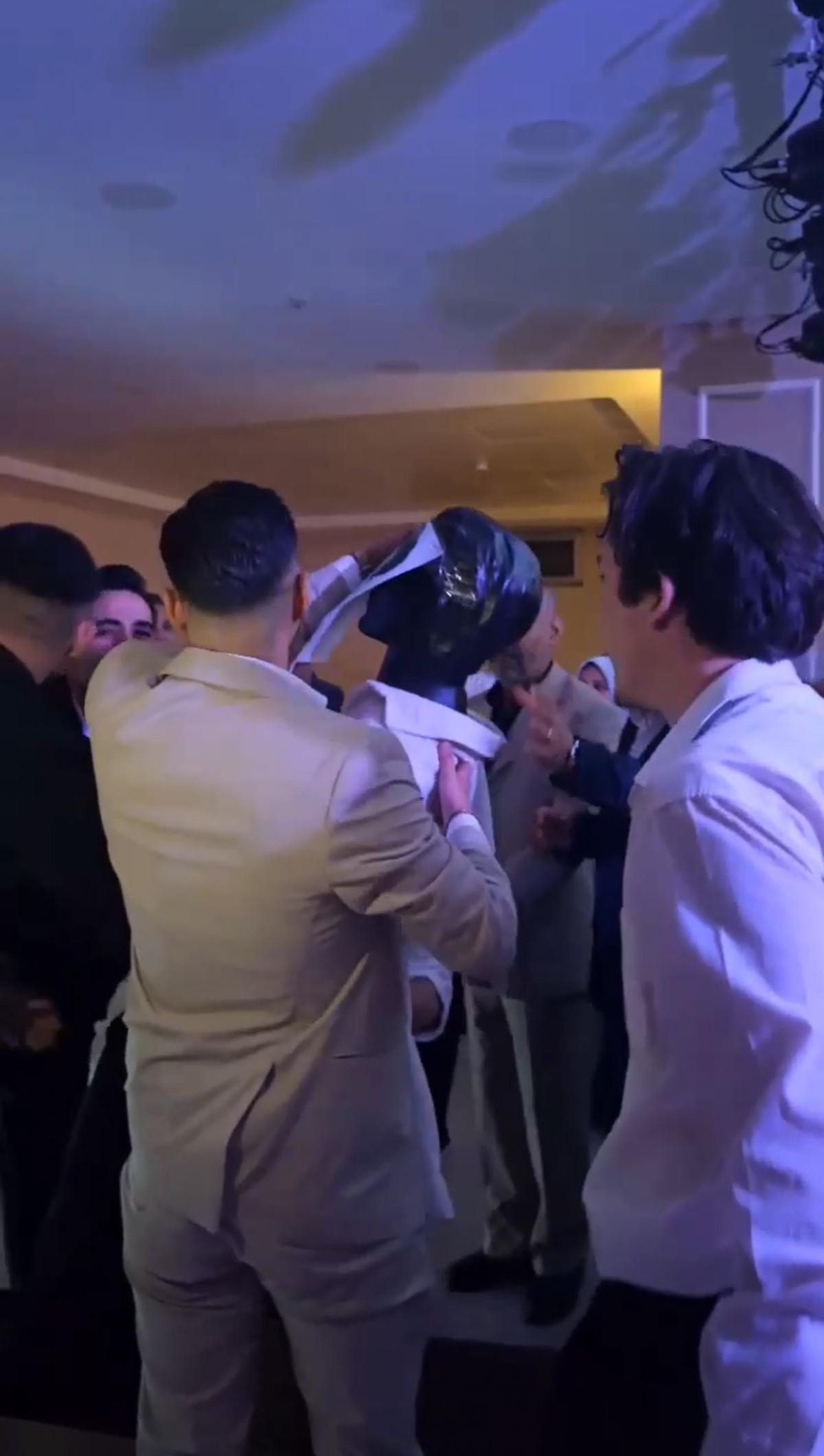 Ardından mikrofon eline alan damadın arkadaşı, “Görkem kardeşimize çamaşır, bulaşık yıkamayı nasip eyleme, ev işlerinden uzak tut yarabbi. Allah mutlu mesut etsin." diyerek dua etti.