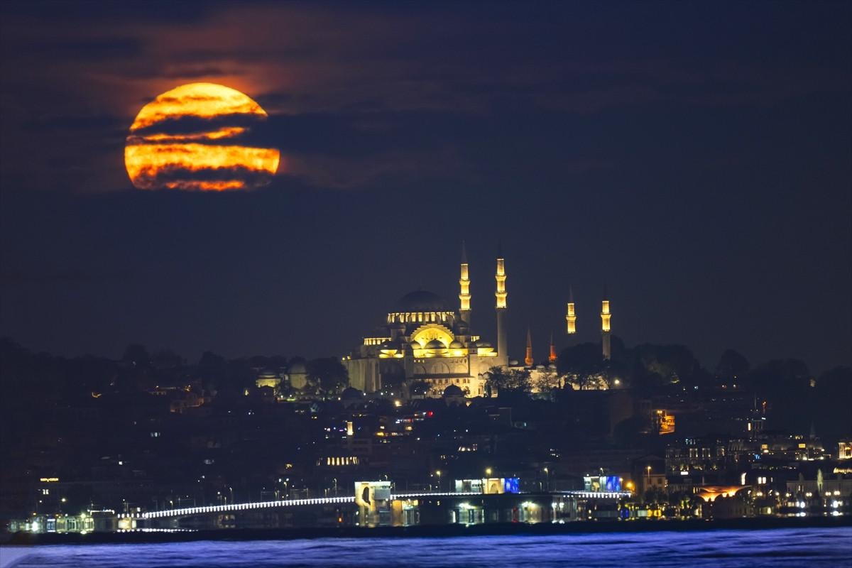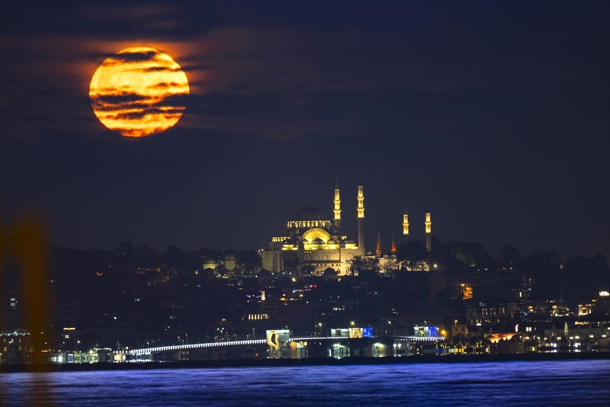 Dolunay adeta tarihi Süleymaniye Camisi ile poz verdi.