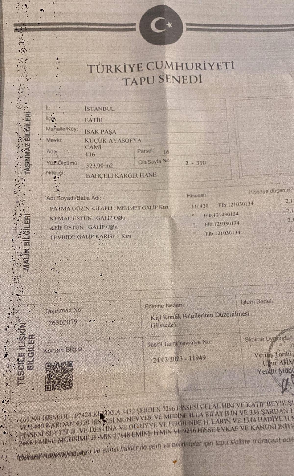 Bu kararların ardından tüm mirasçılar adına yapılan başvuru üzerine Fatih Tapu Müdürlüğü'nce nüfus kayıt güncellemeleri ve ilgili diğer tüm işlemler tamamlanıp, 24 Mart 2023 tarihi itibarıyla 2 alanla ilgili tapular tescil ve teslim edildi.