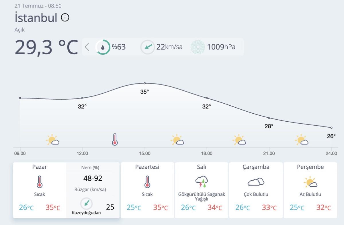 Maltepe'de hava sıcaklığı 26,5, hissedilen sıcaklık 30,3, nem oranı da yüzde 88 oldu.