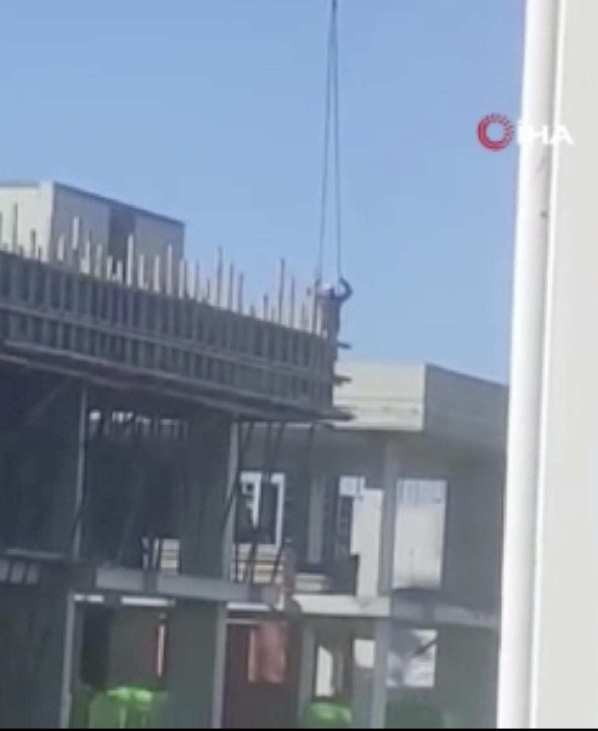 VİNÇ HALATINA OTURUP KARŞI İNŞAATA GEÇTİ
