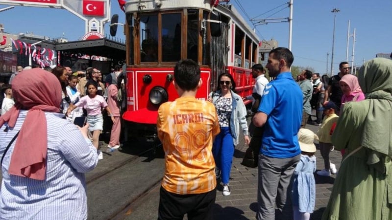 Vatandaşlar cadde boyunca gezdi, özellikle nostaljik tramvay önünde bol bol fotoğraf çektirdi. Turistler gezerek hem havanın hem de bayramın keyfini çıkardı.