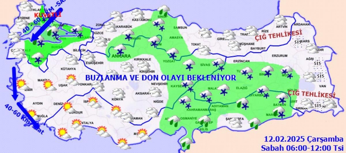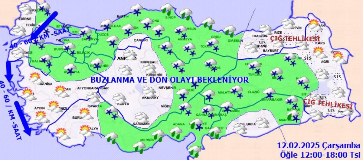 Sabah ve gece saatlerinde iç ve doğu kesimlerde buzlanma ve don ile birlikte pus ve yer yer sis bekleniyor.