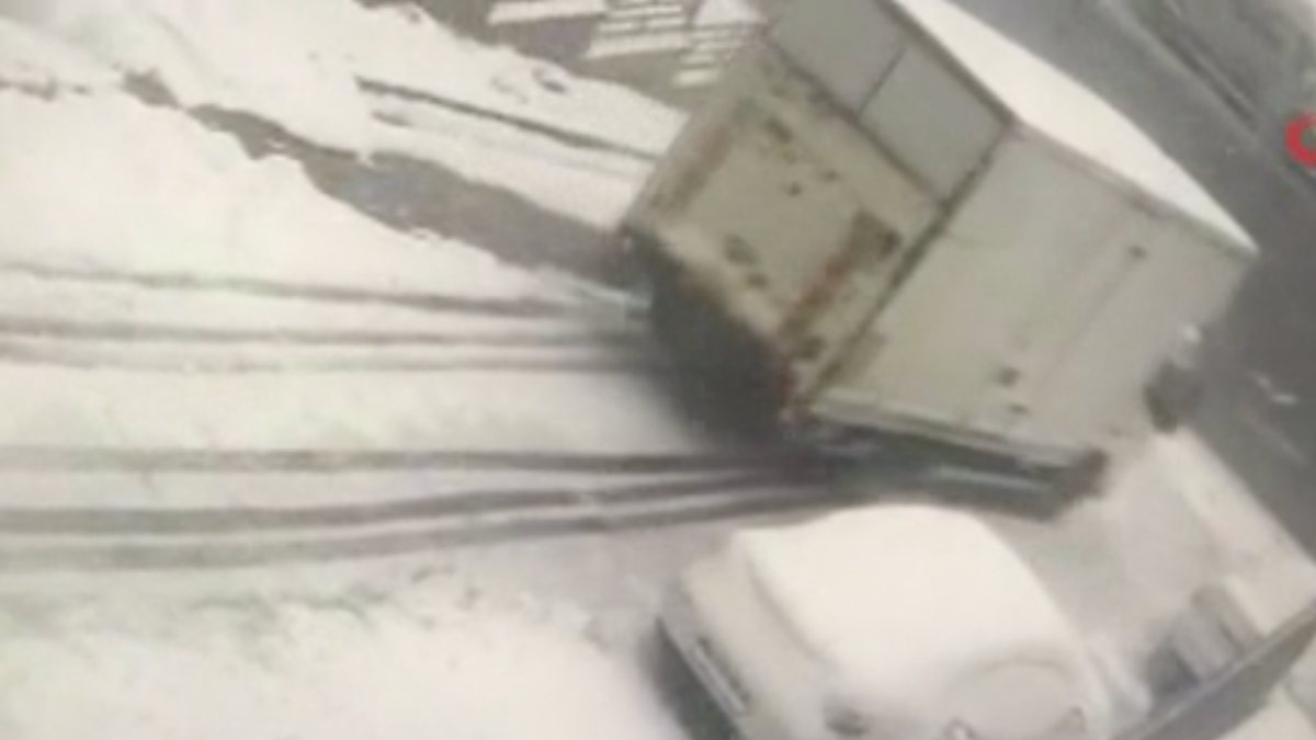 İstanbul'da karda kayan kamyonetin devrilme anı VİDEO