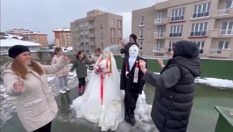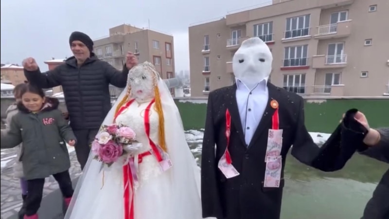 Ardından kardan adamlara gelinlik ve damatlık giydiren grup, düğün düzenleyerek eğlendi.