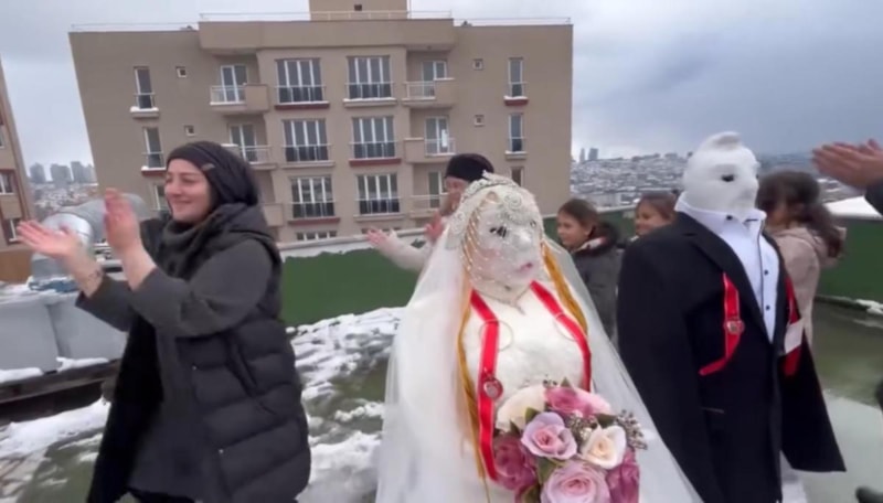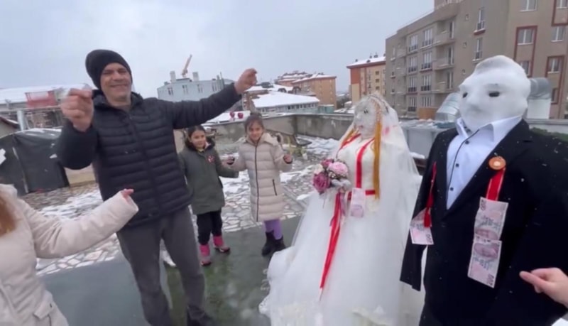 Kağıthane'de yaptıkları kardan adamlara gelinlik ve damatlık giydiren vatandaşların doyasıya eğlencesi kameralara yansıdı.