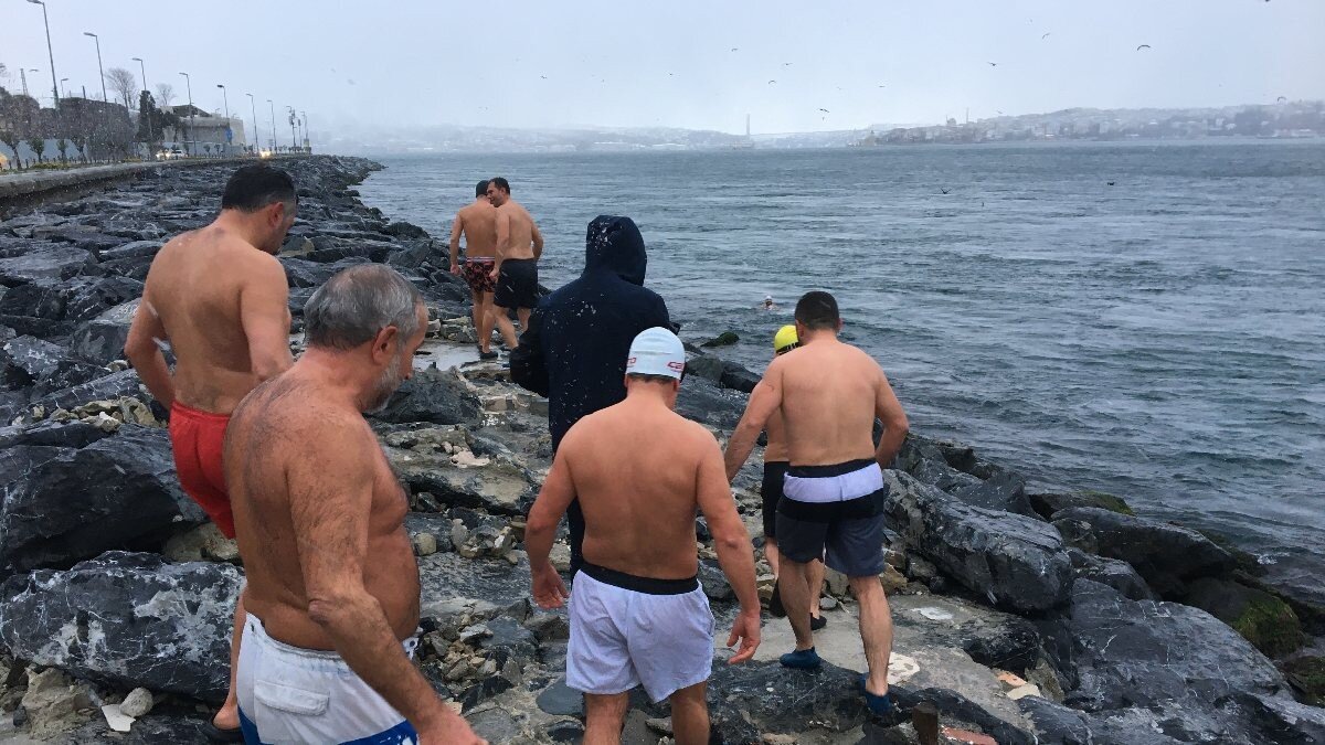 Havaya aldırış etmeden, kendilerine “Sarayburnu Fatihleri” adını veren 10 kişilik arkadaş grubu, sabah saatlerinde Sarayburnu sahilinden denize girdi.