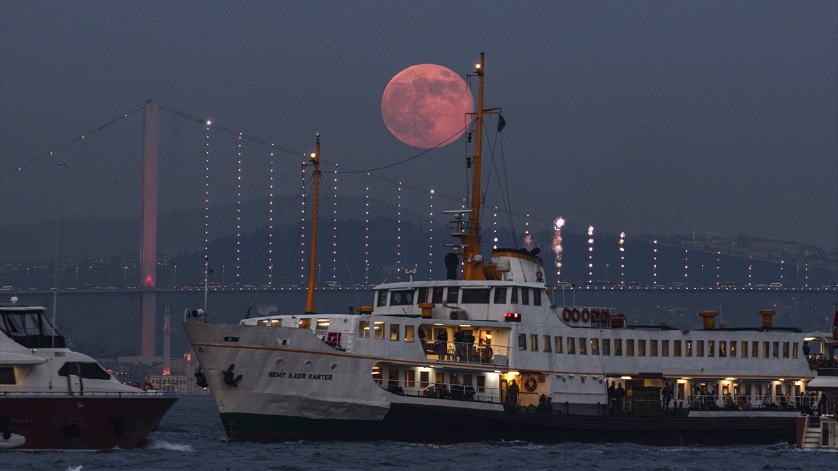 Dolunay, 15 Temmuz Şehitler Köprüsü ve şehir hatları vapurları ile birlikte güzel görüntü oluşturdu.