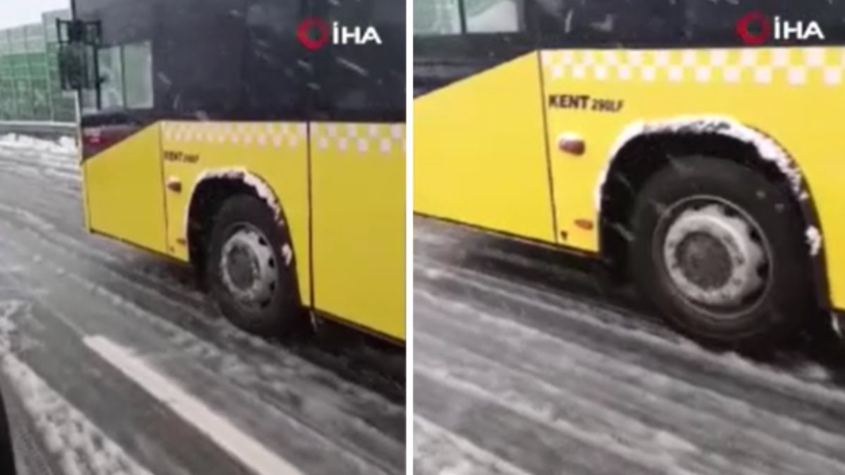 Kağıthane ilçesinde karla kaplanan yolda ilerlemeye çalışan İETT özel halk otobüsünün kaydığı anlar cep telefonu kamerasına yansıdı.