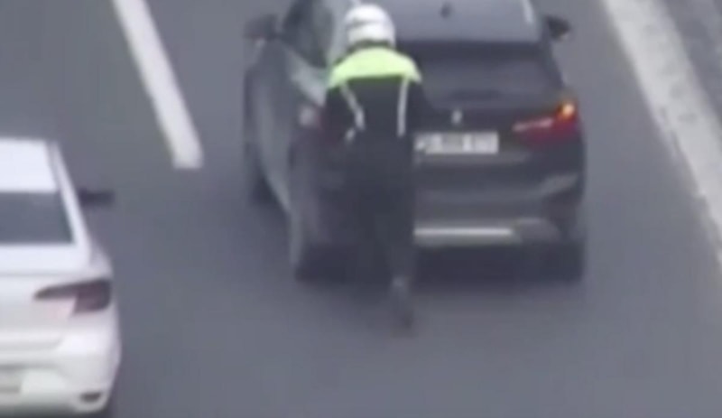 Güvenlik kamerasınca kaydedilen görüntülerde, Fatih Sultan Mehmet Köprüsü'nde arıza yapan cipi, polis memurunun iterek güvenli alana götürdüğü görülüyor.