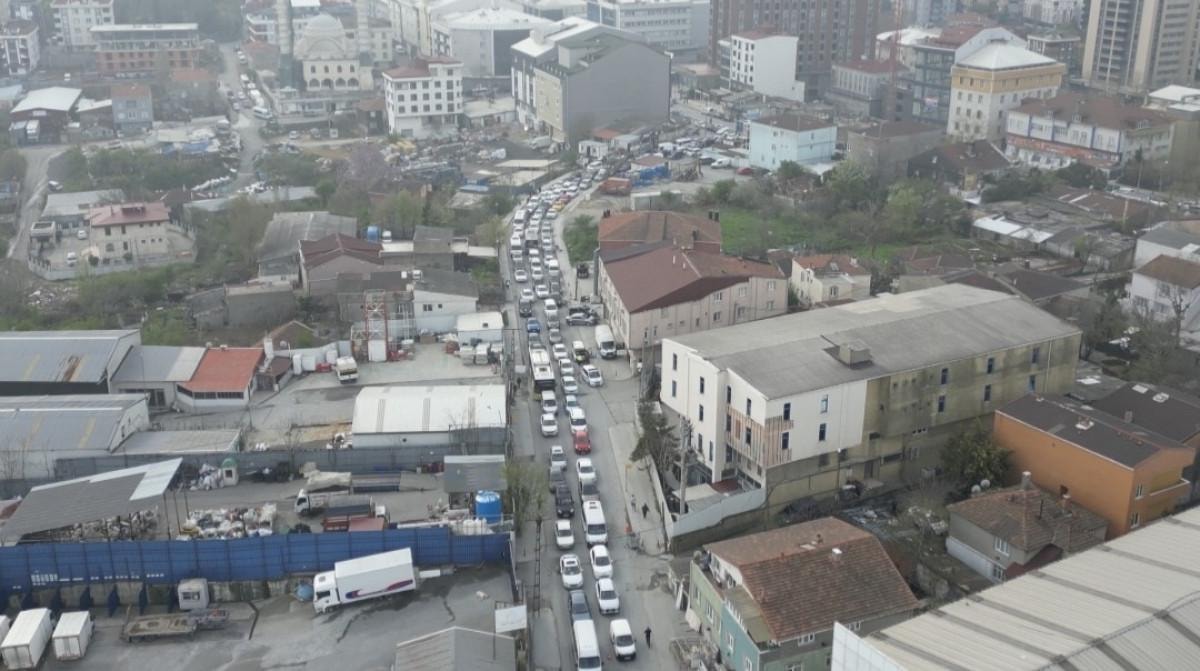 Mezarlık yolunda oluşan trafik dron ile görüntülendi.