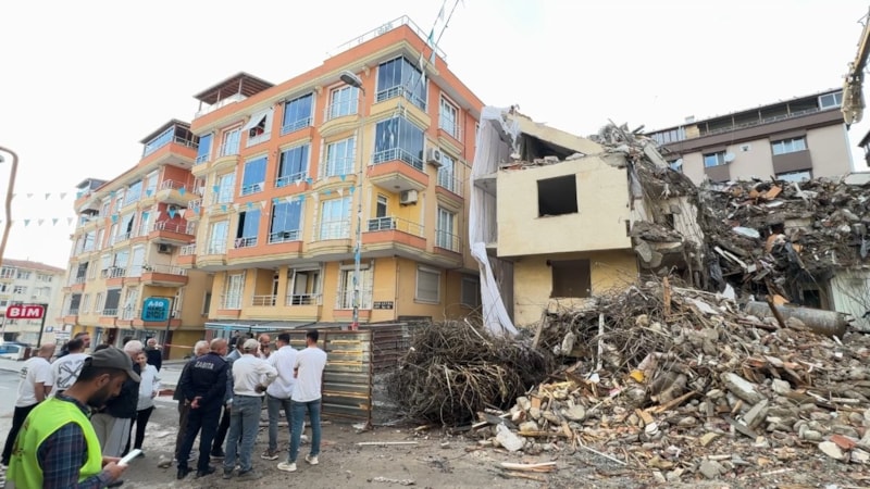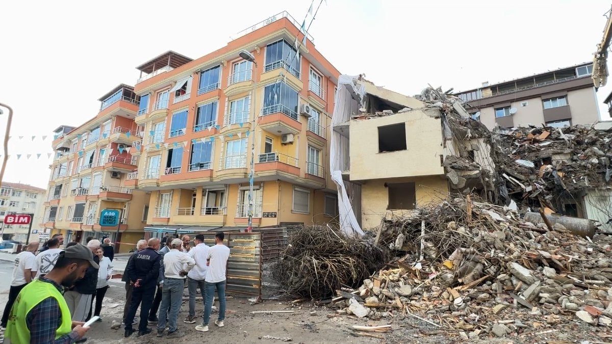 Beton bloğun kayarak yan binaya çarpma riski üzerine yıkım çalışması durdurularak 112 Acil Çağrı Merkezi'ne bilgi verildi.