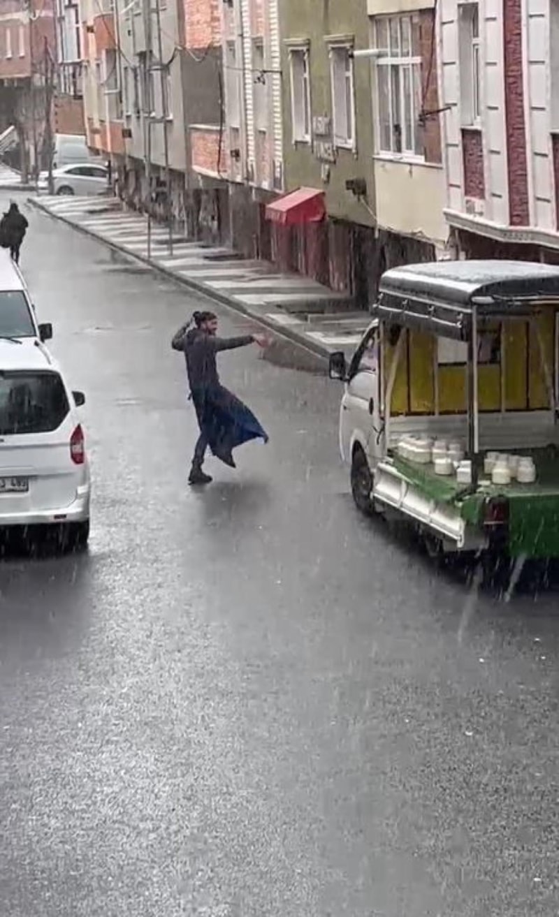 Arnavutköy’de bir seyyar satıcının yağan kara aldırış etmeden aracından müzik açarak sokak ortasında dans ettiği anlar kameraya yansıdı.