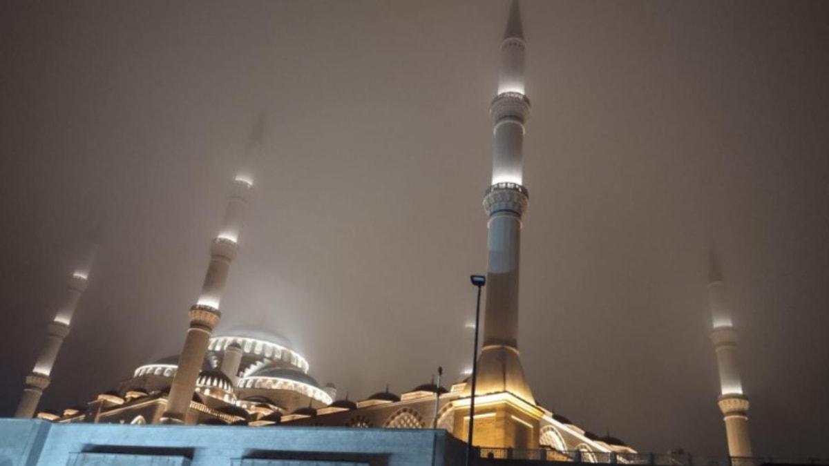 Anadolu Yakası’nda yoğun sis nedeniyle Çamlıca Tepesi'ndeki dev bayrak ve Çamlıca Camii adeta gözden kaybolurken şehrin sisli manzarası Çamlıca Tepesi'nden görüntülendi.