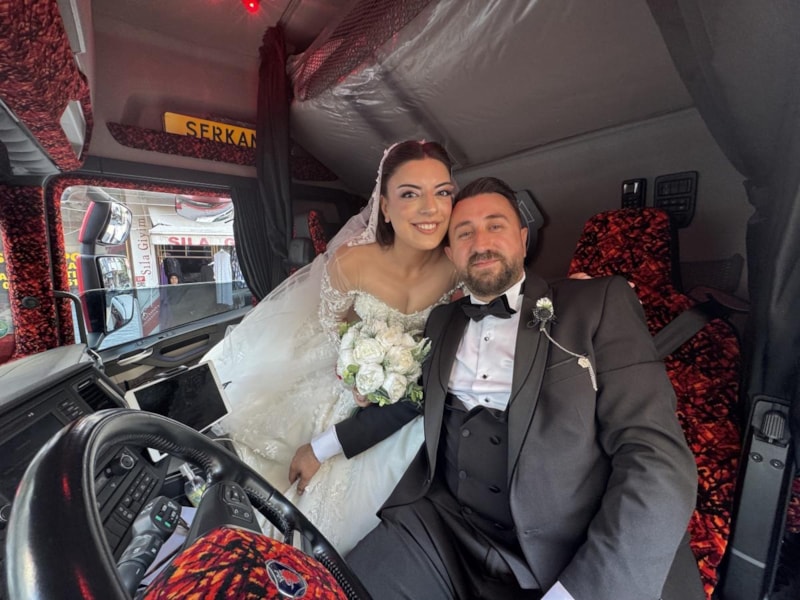 Uluslararası taşımacılık yapan tır şoförü Gökhan Yıldız, eşiyle aynı sektörde çalışmanın verdiği ilhamla, son model kırmızı tırını gelin arabasına dönüştürdü.