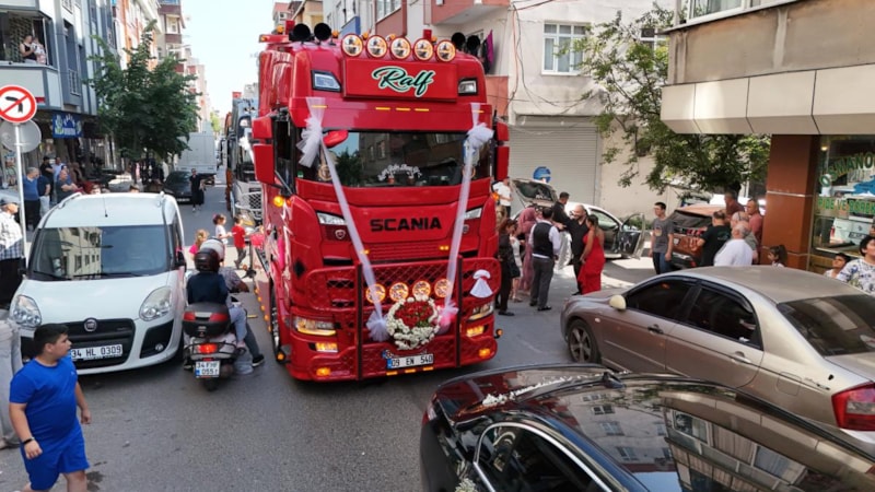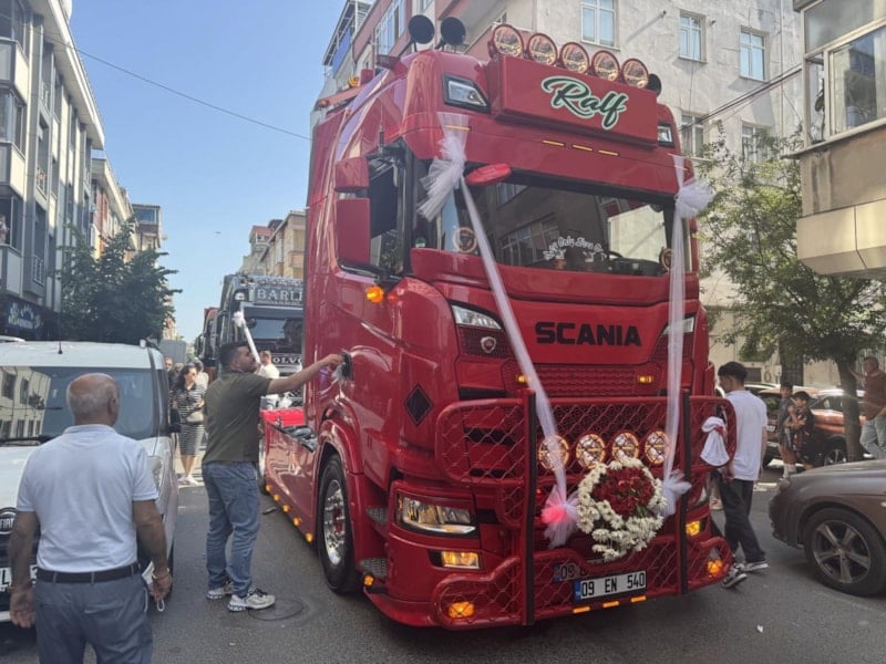Bağcılar’da, tır şoförü Gökhan Yıldız’ın gelin arabası olarak süslediği son model kırmızı tır ve oluşturduğu tır konvoyu renkli görüntülere sahne oldu. Lojistik sektöründe çalışan çiftin hayalini gerçekleştiren konvoy, vatandaşların da büyük ilgisini çekti.