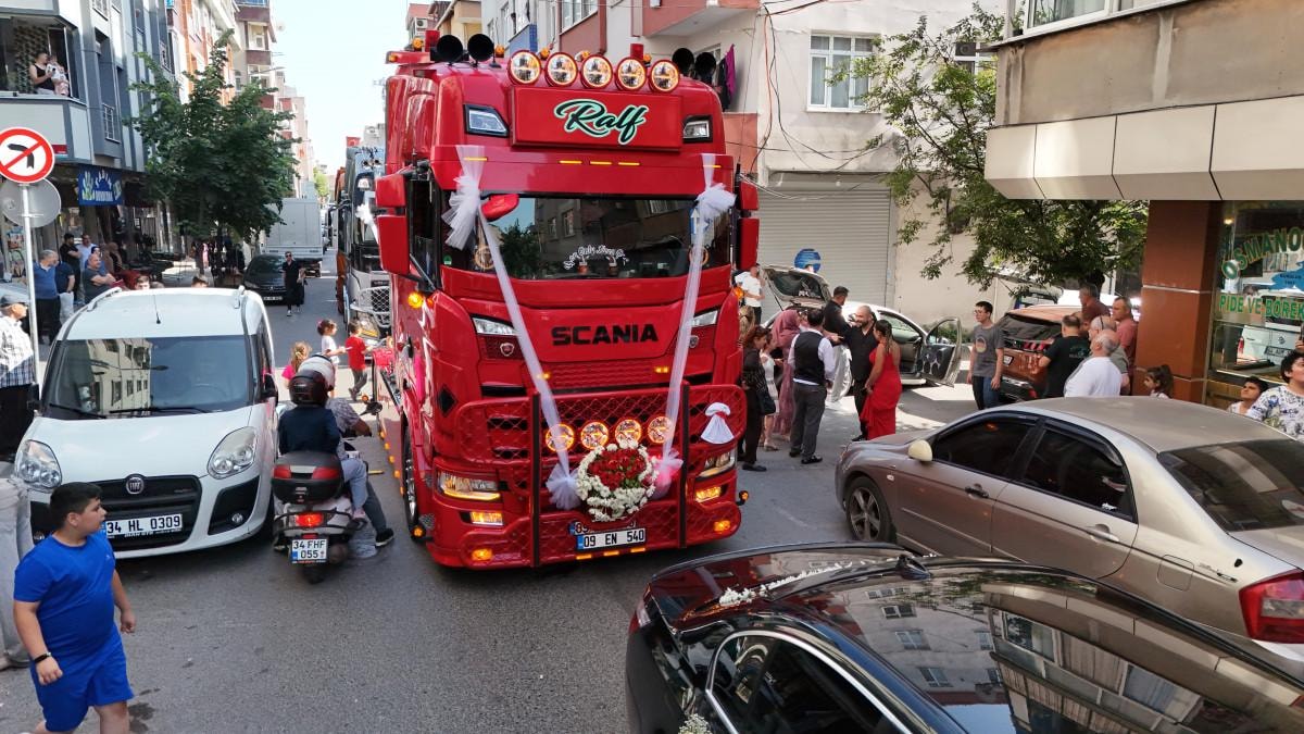Son model kırmızı tır ile gelin almaya gelen Gökhan Yıldız, "Biz bu işi gönül vererek severek yapıyoruz. Gönül vererek yaptığımız işi layığı ile yaptığımıza inanıyorum. Eşim de lojistik işinde çalışıyor" dedi.
