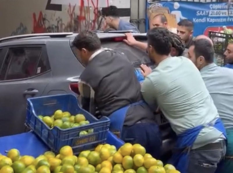 - Araç sahibine ulaşılamayınca, pazarcılar otomobili halat yardımıyla çekerek karşı kaldırıma taşıdı.