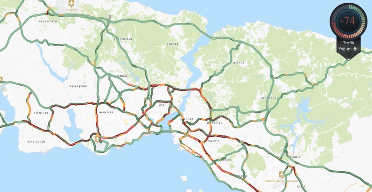 İstanbul'da hafta sonu olmasına rağmen yağmurun da etkisiyle trafik yoğunluğu yüzde 74'e kadar çıktı.
