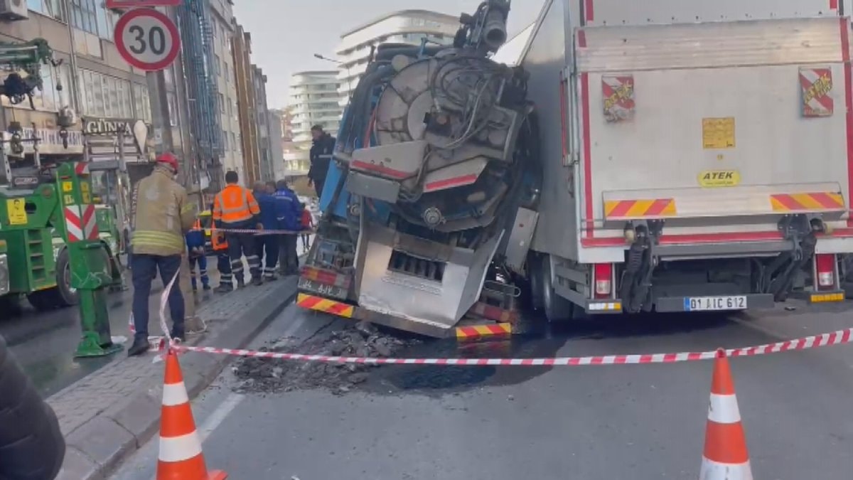 Bu sırada cadde üzerinde ilerleyen iki kamyon, asfaltta meydana gelen çukurun içine düştü.