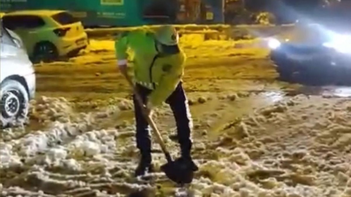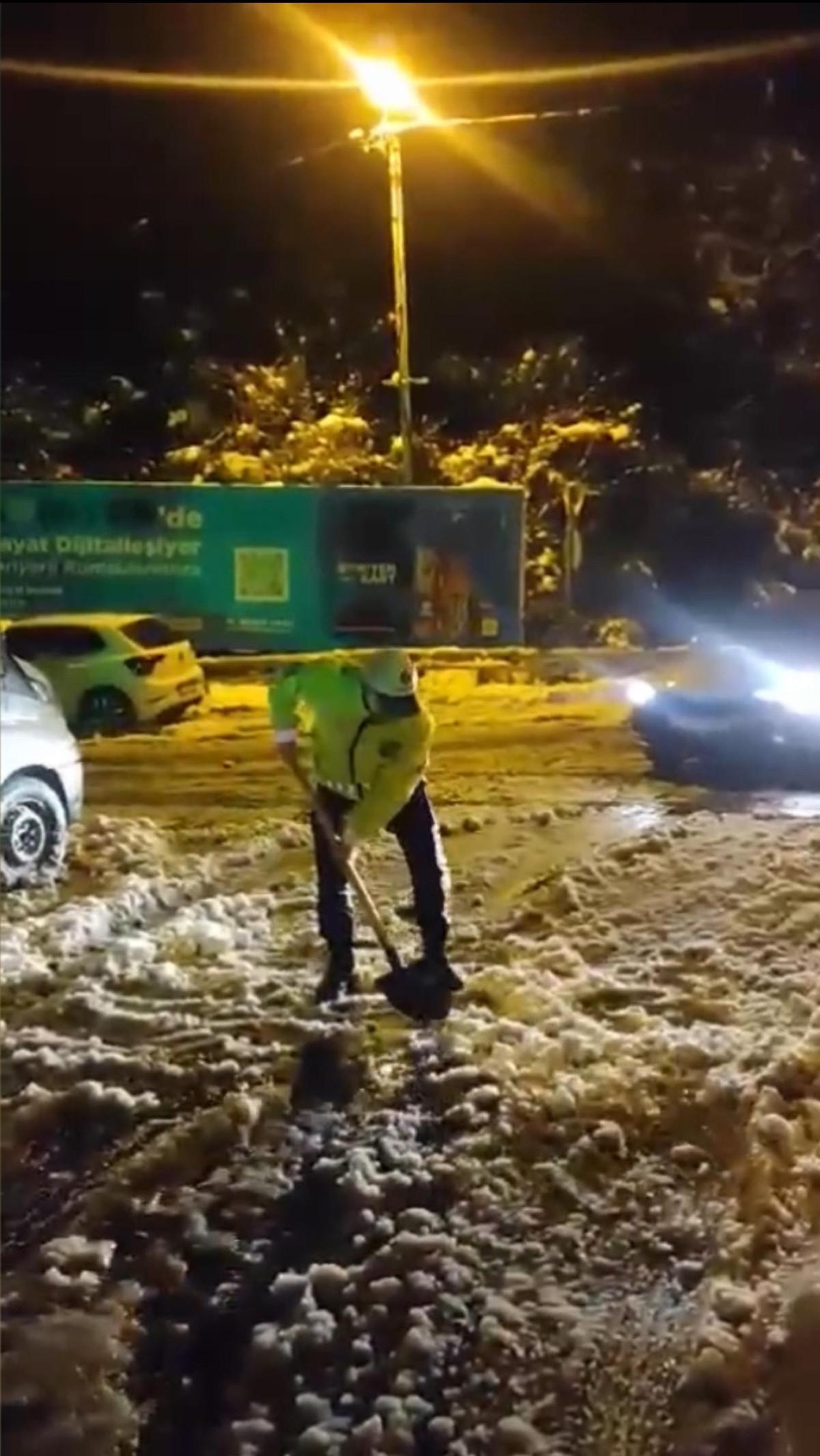 Mahsur kalan araçları gören polis ekipleri, kürekle yolları açtı.