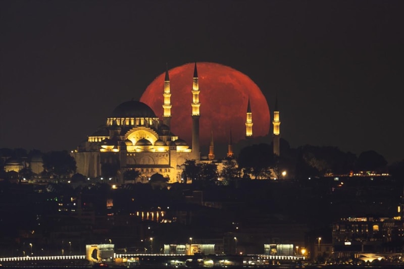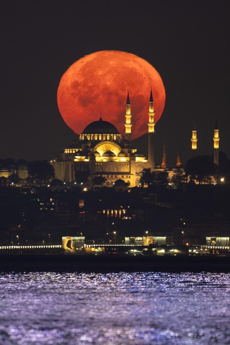 İstanbul'da dolunay ve Süleymaniye Camii ile birlikte eşsiz görüntüler ortaya çıktı.