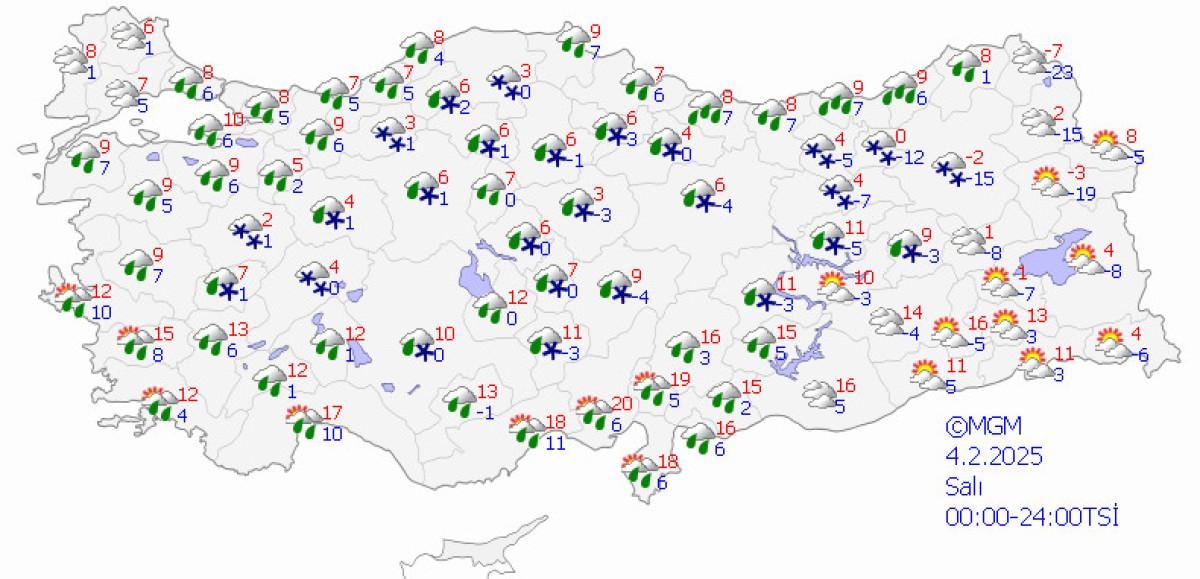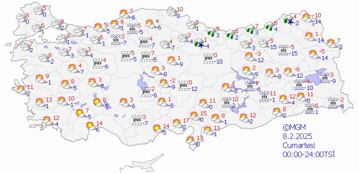 Çok bulutlu, sabah saatlerinde yağmurlu, akşam saatlerinden itibaren ani sıcaklık düşüşü ile birlikte gece karla karışık yağmur, iç ve yüksekleri kar yağışlı