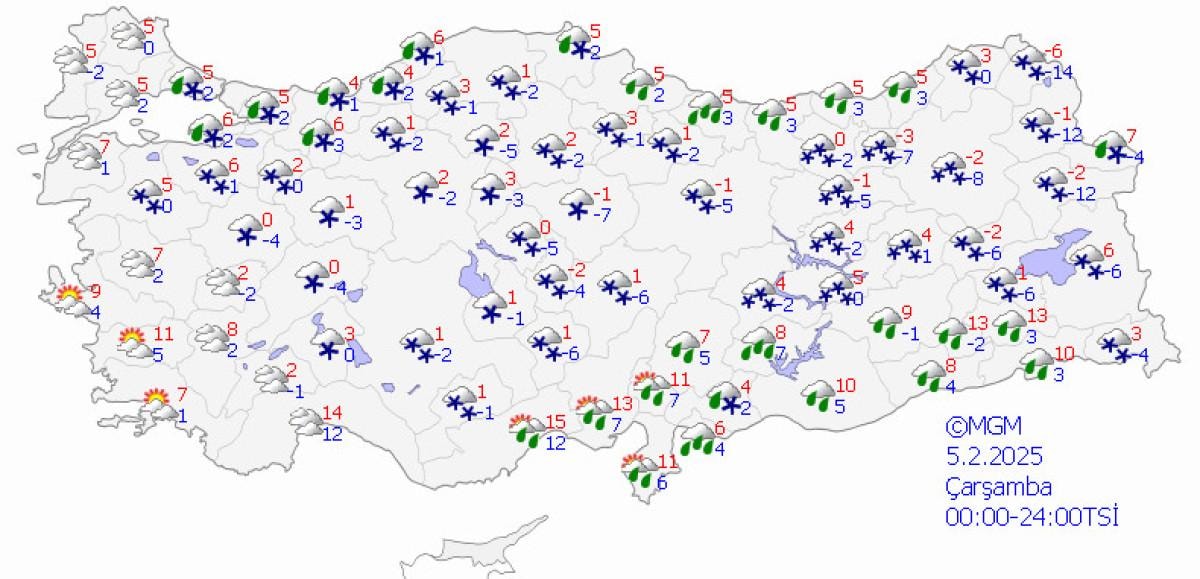 Çok bulutlu ve aralıklı yağmurlu, gece saatlerinden itibaren ani sıcaklık düşüşü ile birlikte kıyıları karla karışık yağmur iç ve yüksekleri yer yer kar yağışlı