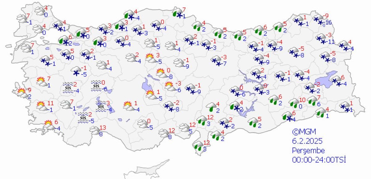 Çok bulutlu, sabah saatlerinde karla karışık yağmur ve yüksekleri kar, gece saatlerinden itibaren il geneli kar yağışlı