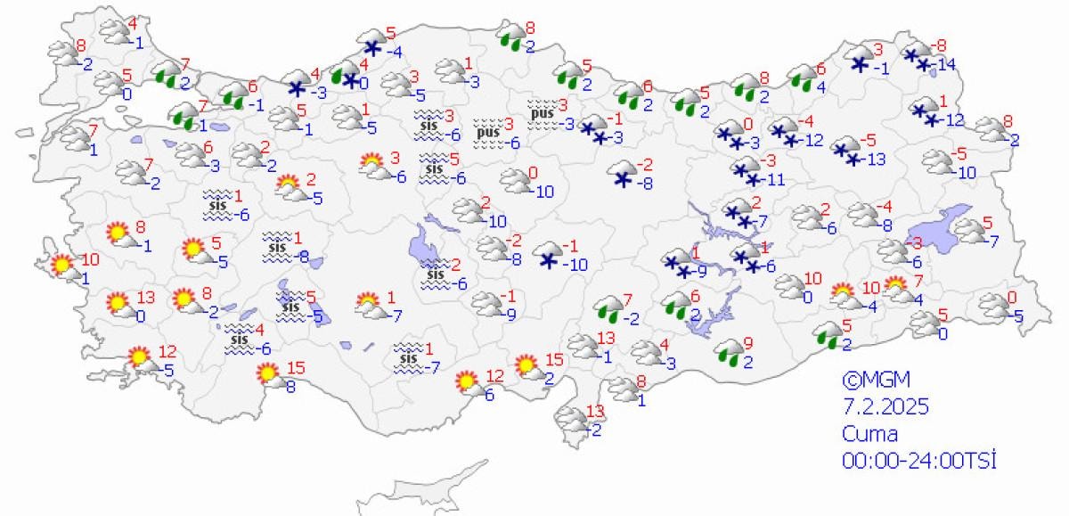 Parçalı ve çok bulutlu, öğle saatlerinde hafif olmak üzere karla karışık yağmur ve yüksek kesimleri kar yağışlı (Akşam saatlerinden itibaren ani sıcaklık düşüşü ile birlikte gece kuvvetli buzlanma ve don olayı bekleniyor)