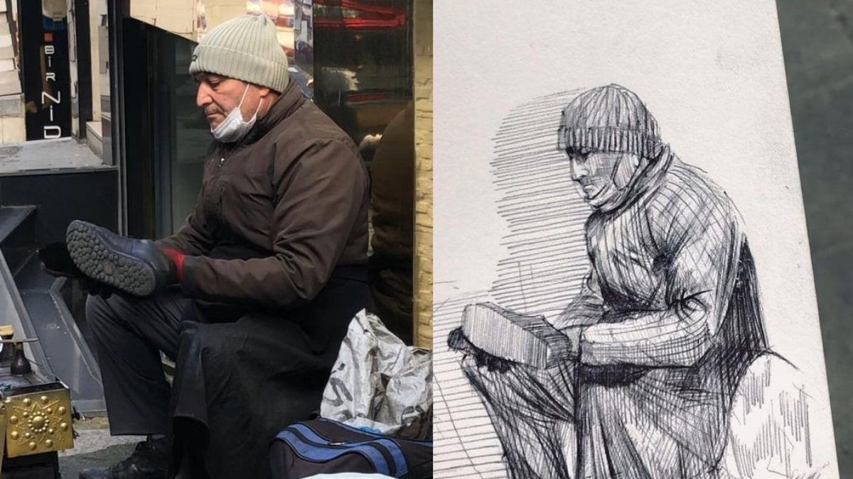 Çalıştığı iş yerinde dükkana gelen müşterileri hobi olarak resmeden Çakıcı, sanatını sokaklara taşıdı.
