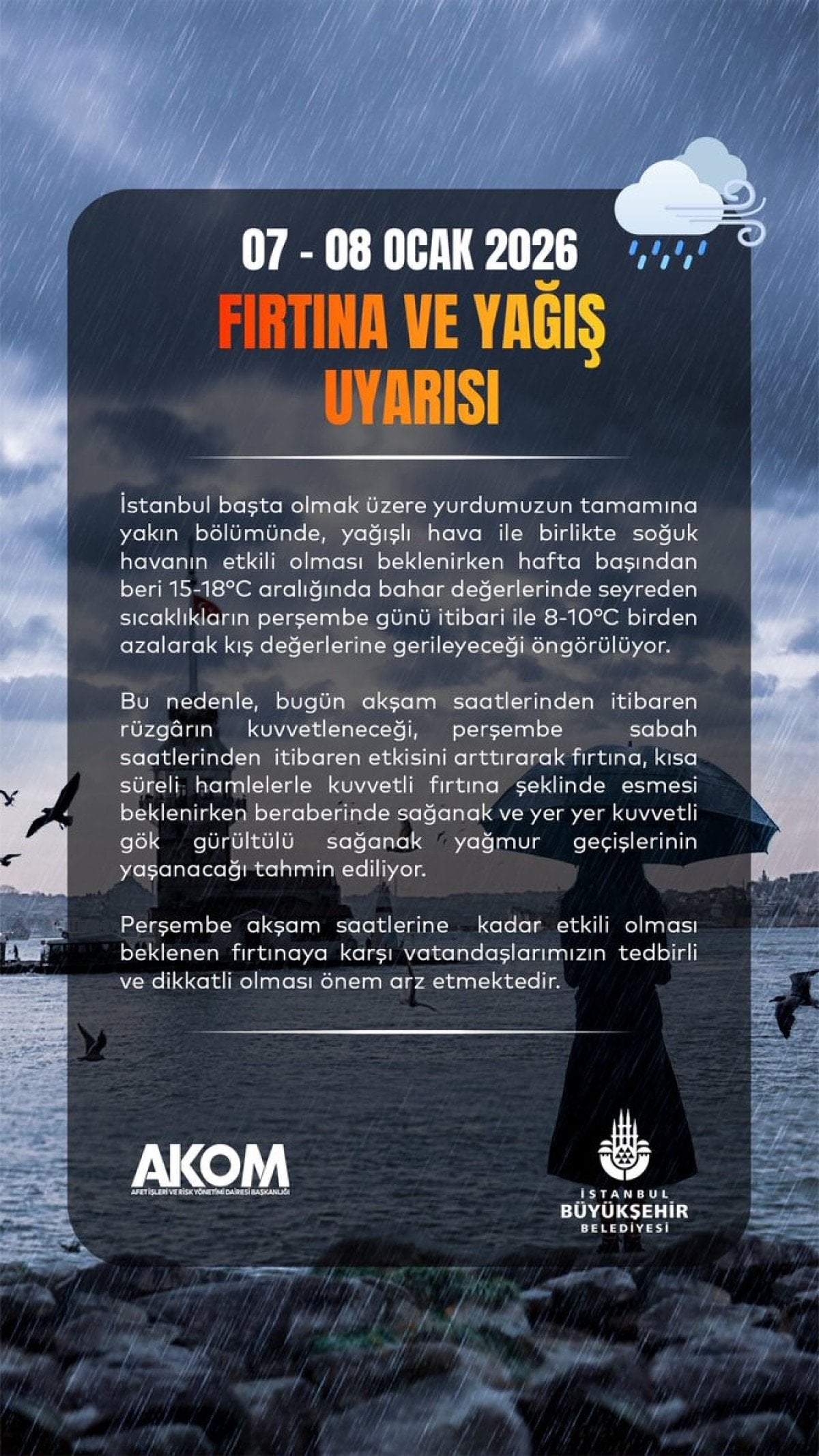 İstanbul Valiliği'nden yapılan açıklamada ise "İstanbul’da Cuma günü hava sıcaklığı hissedilir şekilde düşecek Meteoroloji Genel Müdürlüğü'nün değerlendirmelerine göre; 08.01.2026 Perşembe günü sabah saatlerinden itibaren rüzgârın güney ve güneybatı (Lodos) yönlerden kuvvetli rüzgâr ve fırtına (50-70 km/saat, yüksek kesimler başta olmak üzere yer yer 80-90 km/saat) olarak eseceği tahmin edilmektedir.