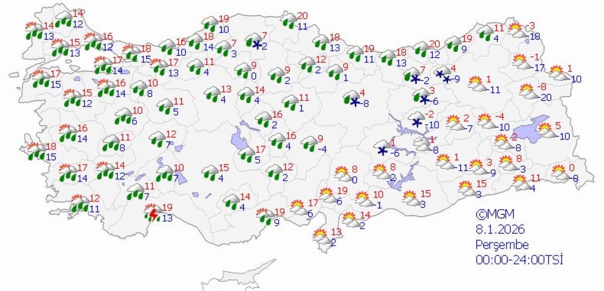 08.01.2026 Perşembe görülecek sağanak, gök gürültülü sağanak yağışların yerel kuvvetli olması beklenmektedir.