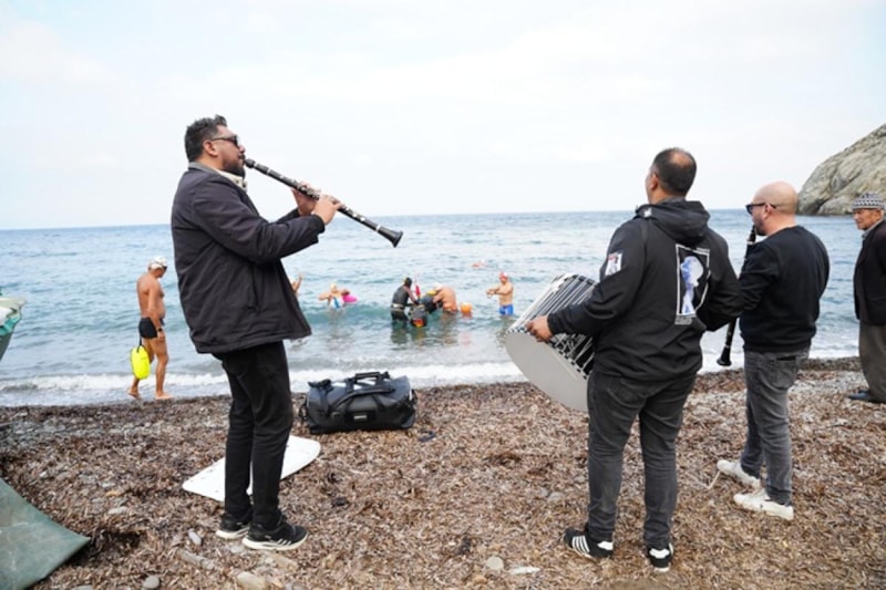 Davul zurna eşliğinde denize açılan yüzücüler, yaklaşık 3 kilometrelik bir parkuru birlikte yüzerek tamamladı.