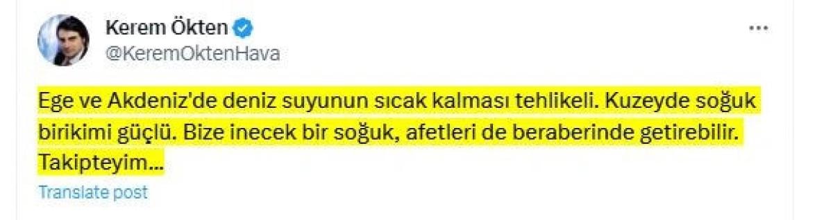 Ökten, "Ege ve Akdeniz'de deniz suyunun sıcak kalması tehlikeli. Kuzeyde soğuk birikimi güçlü. Bize inecek bir soğuk, afetleri de beraberinde getirebilir. Takipteyim..." dedi.