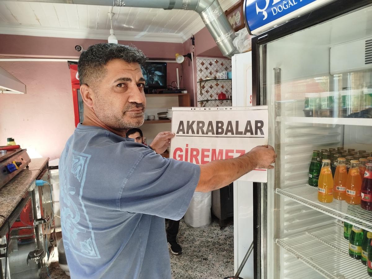 İş yerinin ortağı olan Hasan Eriş ise, "Akrabalardan sıkıldığımız için bu pankartı astık; yeter artık. Gelen yiyor, içiyor, parasını vermiyor. Akraba değil akreptirler." sözlerine yer verdi.