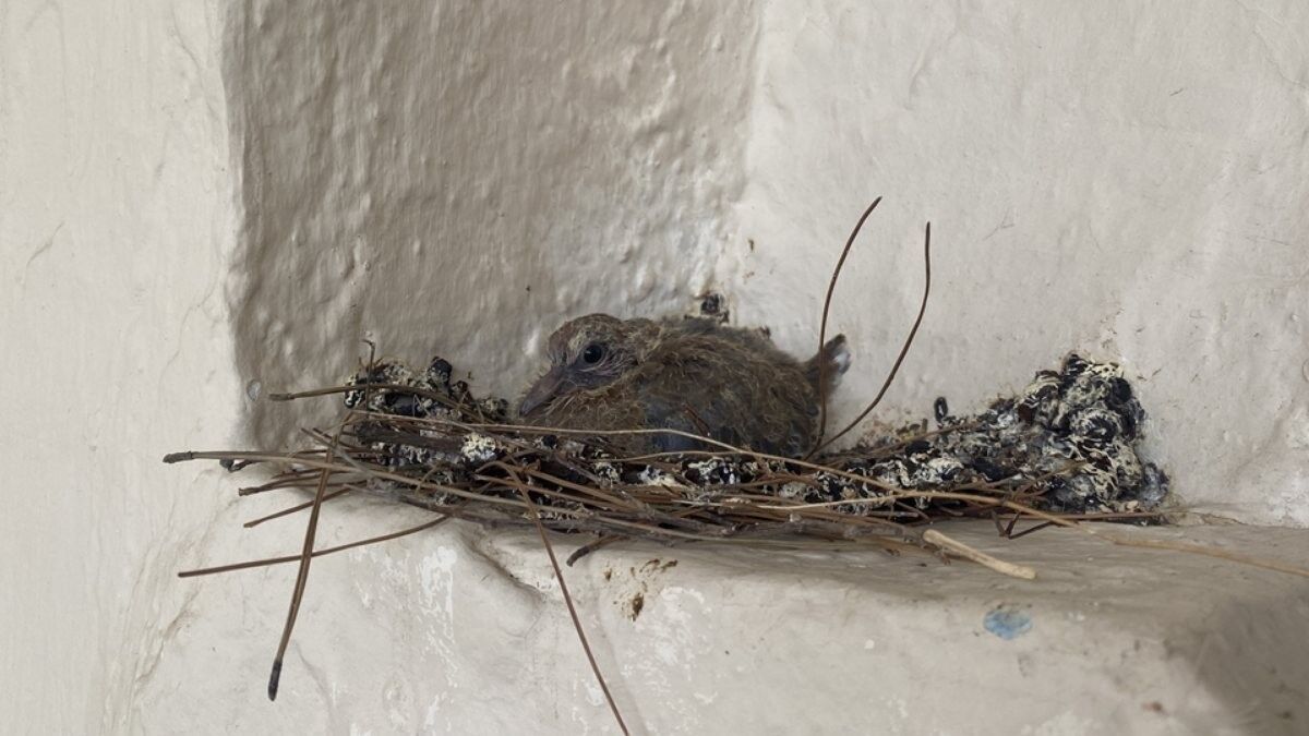 İzmir'in Tire ilçesi Tahtakale Camisi İmam Hatibi Bayram Adıgüzel, cami penceresinde, bir kumrunun yavrusuyla yaşadığı yuvasının korunması için, cemaate özel bir not hazırladı.