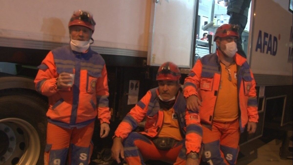 Uzun saatler boyunca enkazda arama kurtarma faaliyeti gösteren ekip personellerinin kısa mola zamanlarındaki yaşadıkları yorgunluk yüzlerinden okundu.