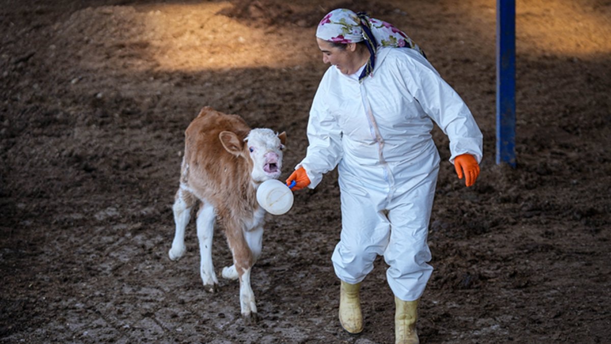 Traktör de kullanan girişimci kadın, buzağılarını da biberonla besliyor.