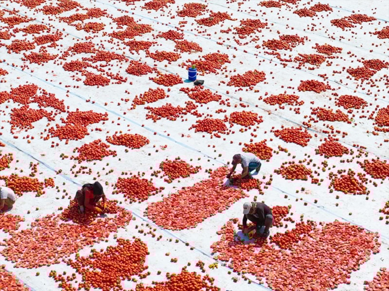 Torbalı ilçesinde kurutmalık domates sezonu başladı. Günde 20 kamyon domates tarlalara serilirken Güneydoğu’dan gelen tarım işçileri, 40 dereceyi aşan sıcakta mesai yapıyor.